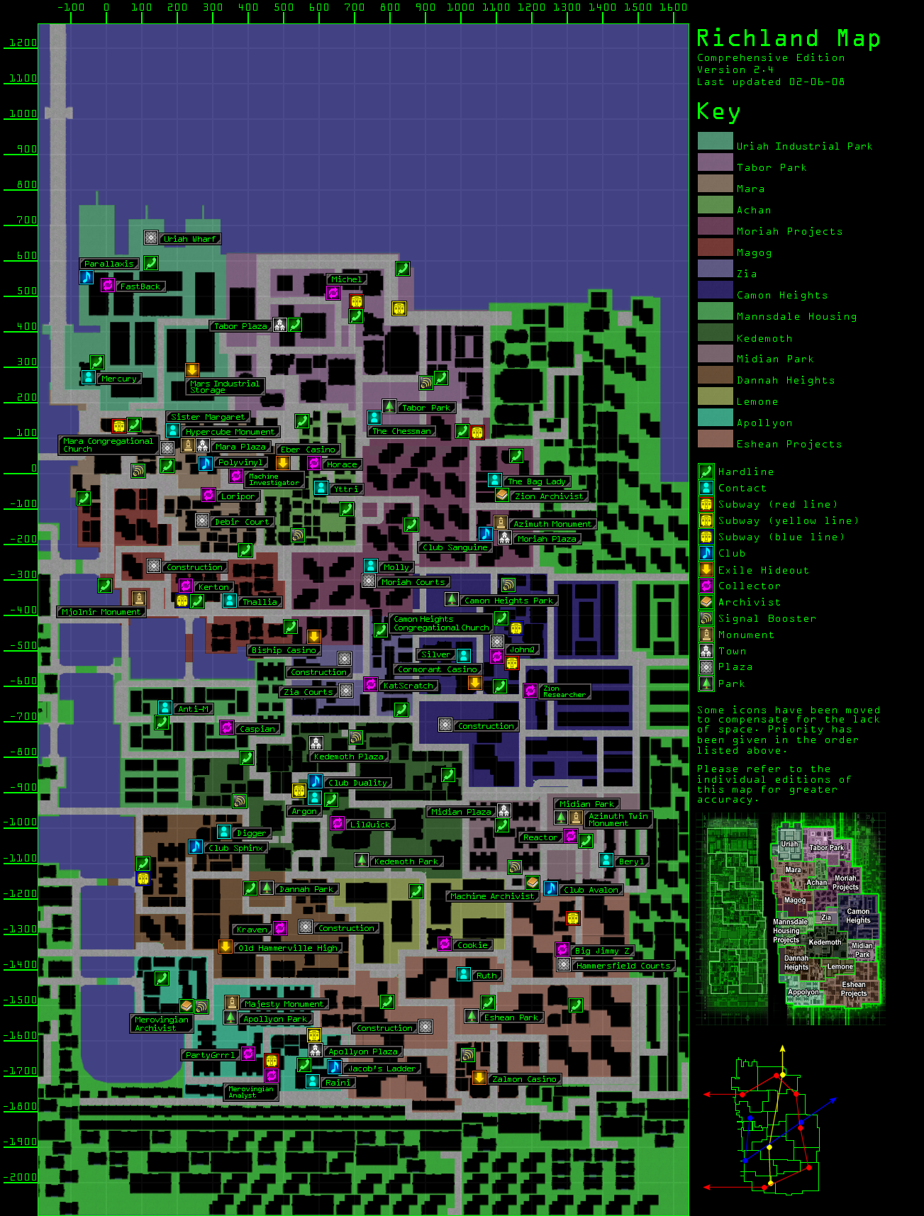 This map includes every hardline, monument, subway, club, exile hideout, collector, town, plaza, and park. Some icons are not placed in their exact original locations to due space constraints.