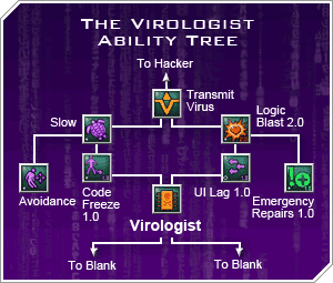 When behind a Soldier or summoned simulacra, the Virologist is free to use his Logic Blast 2.0 and ranged attacks to soften up the opposition. Strategic use of Slow and Code Freeze 1.0 will allow the rest of your team to focus on quickly wiping out individual enemies. If you do attract unwanted attention, Avoidance will help keep your foes from turning on you. In addition, your teammates will appreciate having UI Lag 1.0 used against their opponents.